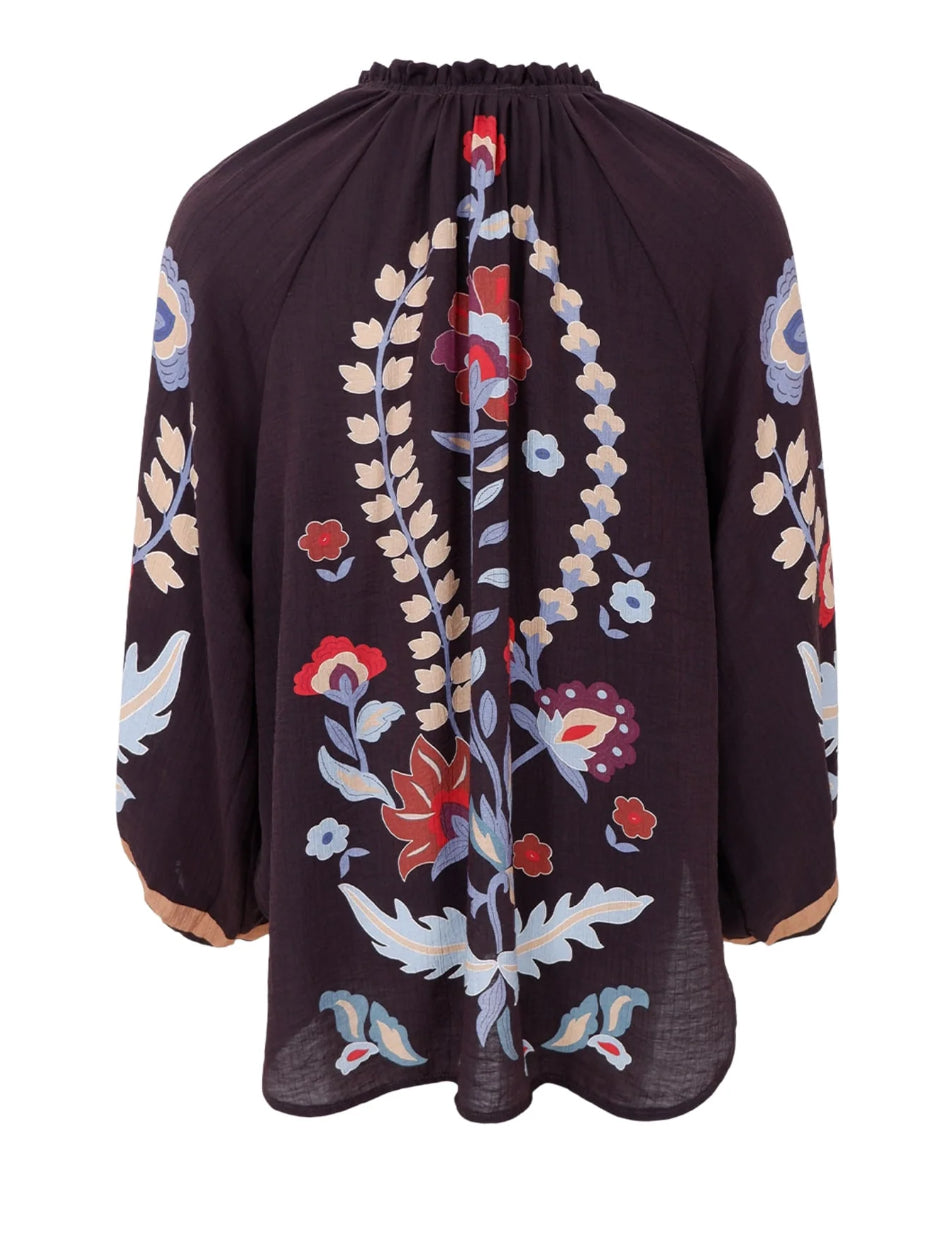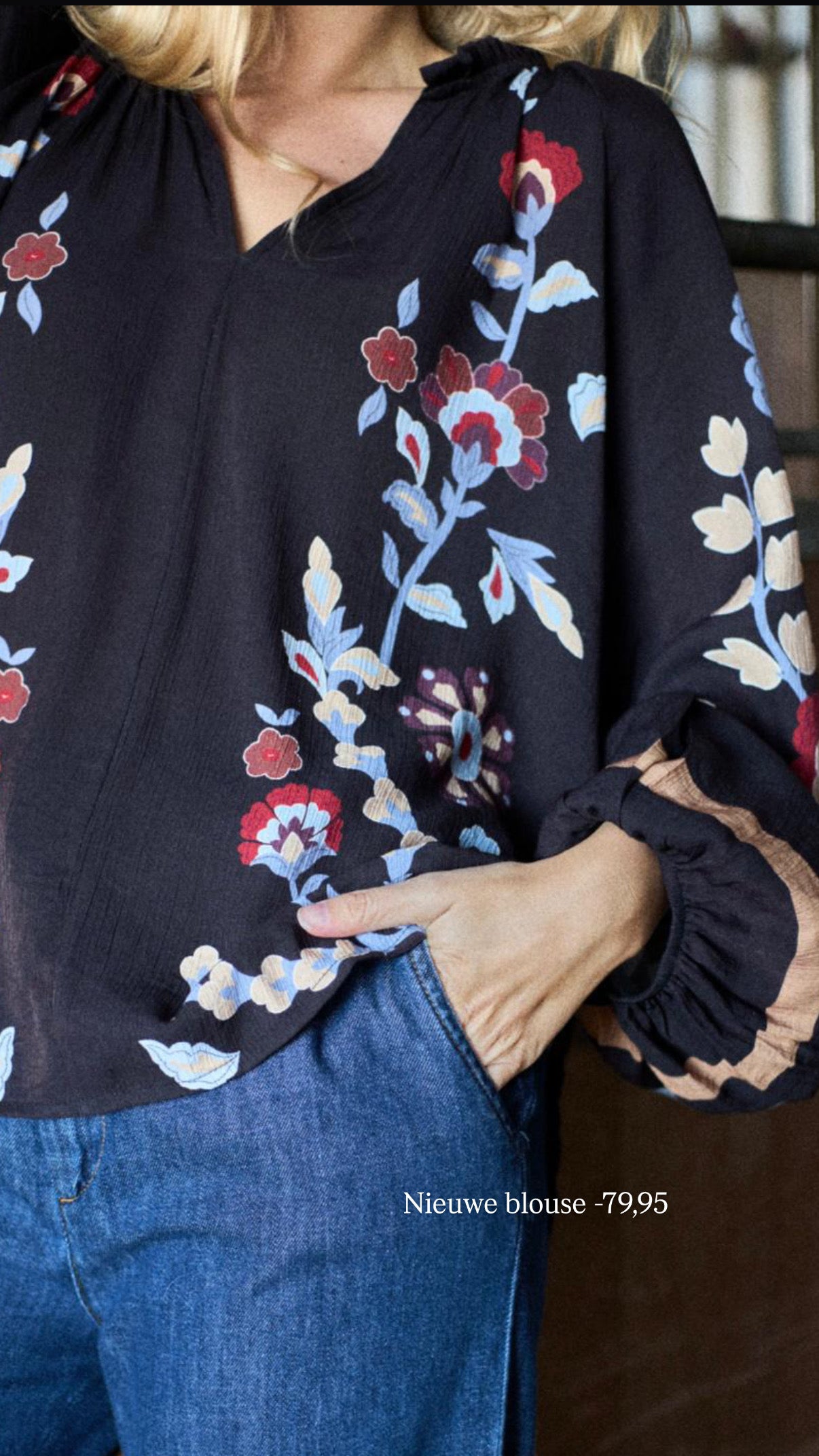 Deze heerlijke ruime blouse heeft een v-hals met een grote pofmouw met elastisch koord. De blouse heeft een leuke vrolijke bloemenprint
