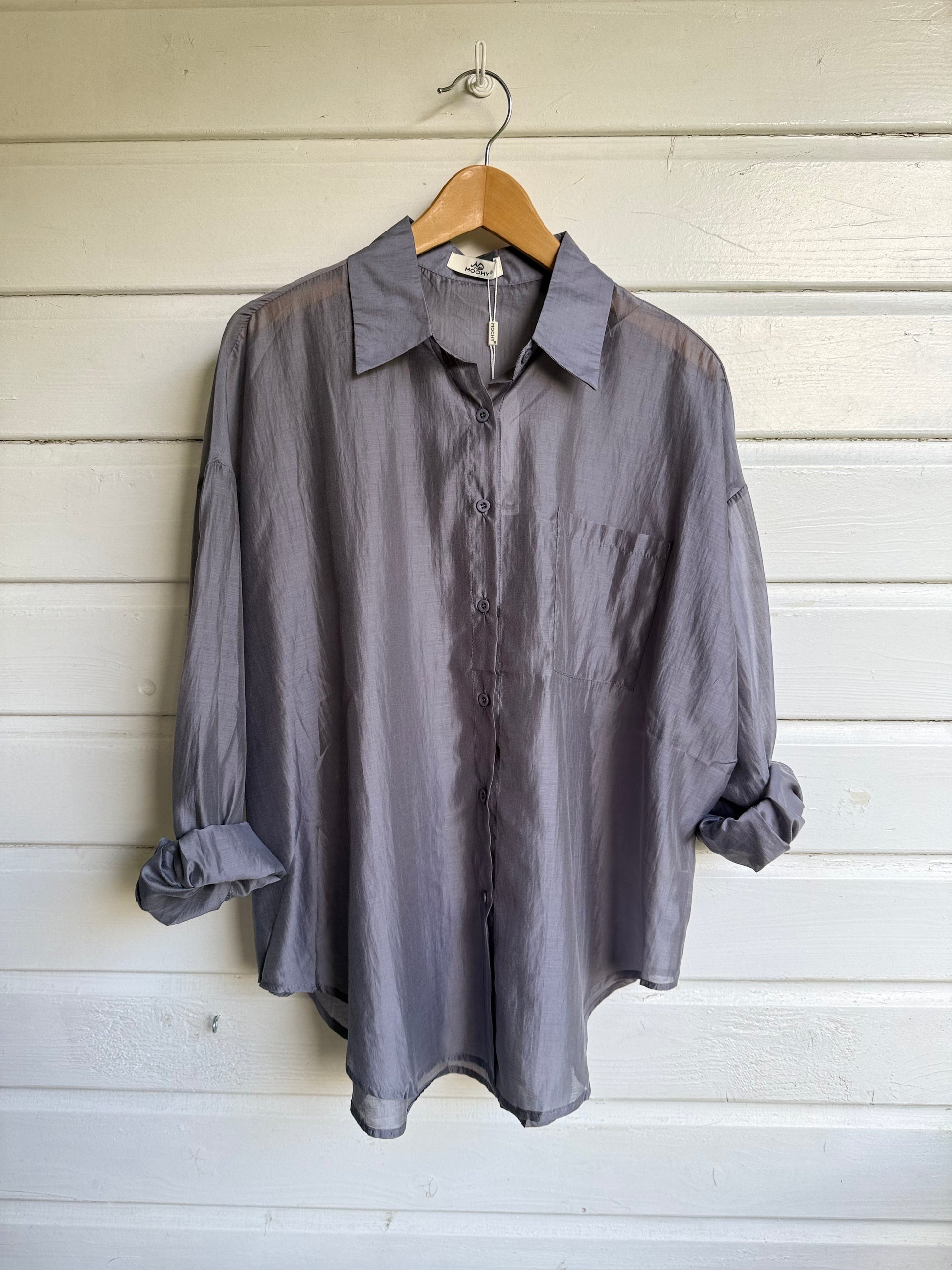 Mooie zijde blouse, oversized doorknoop model met kraag, lange mouw en één borstzakje. Iets transparant, klein glansje