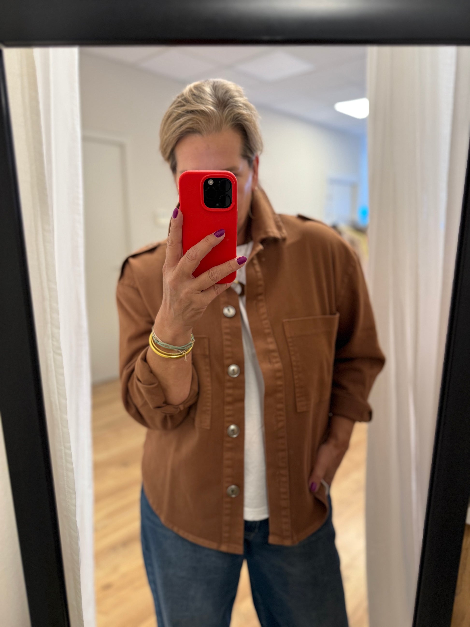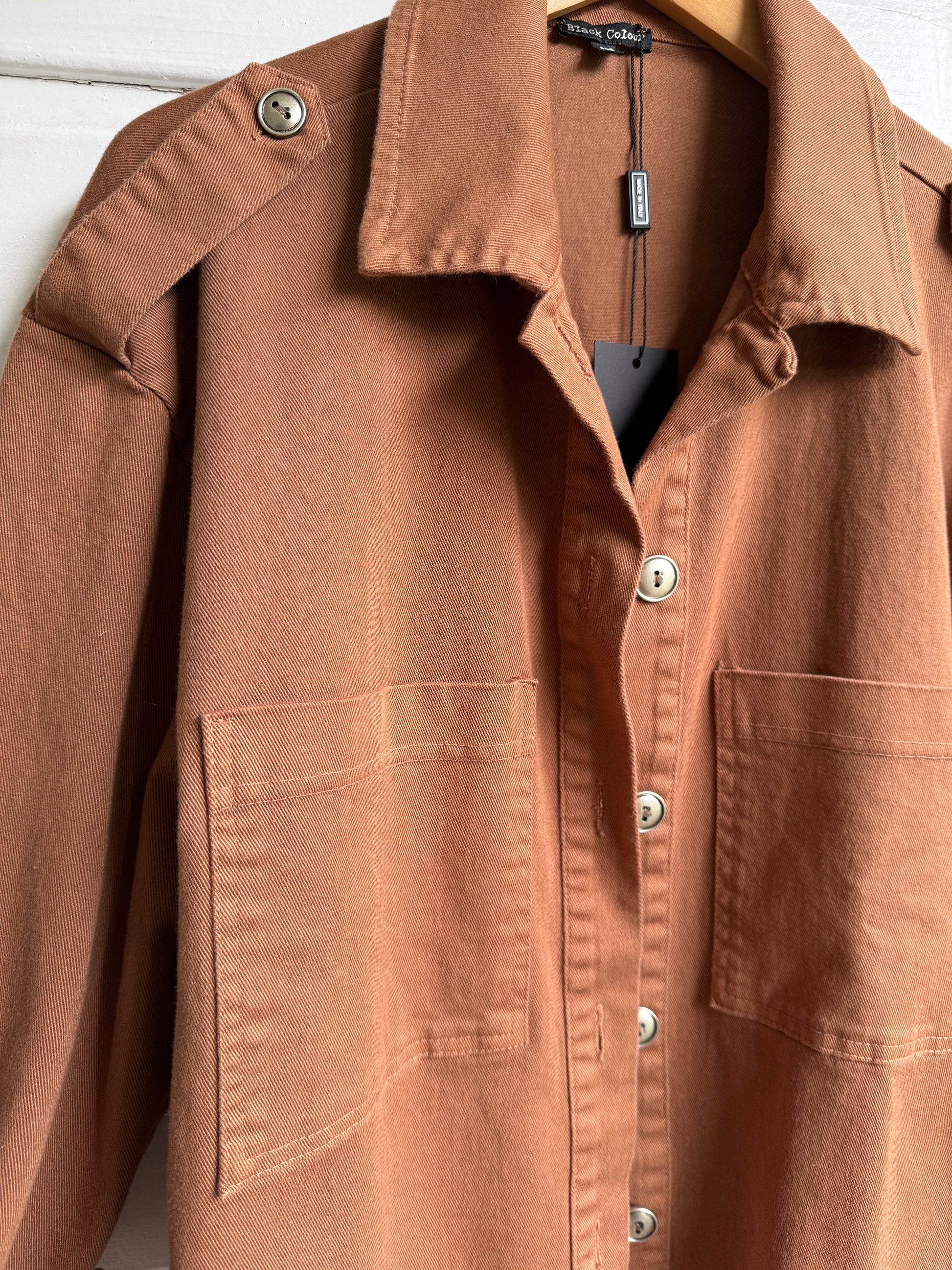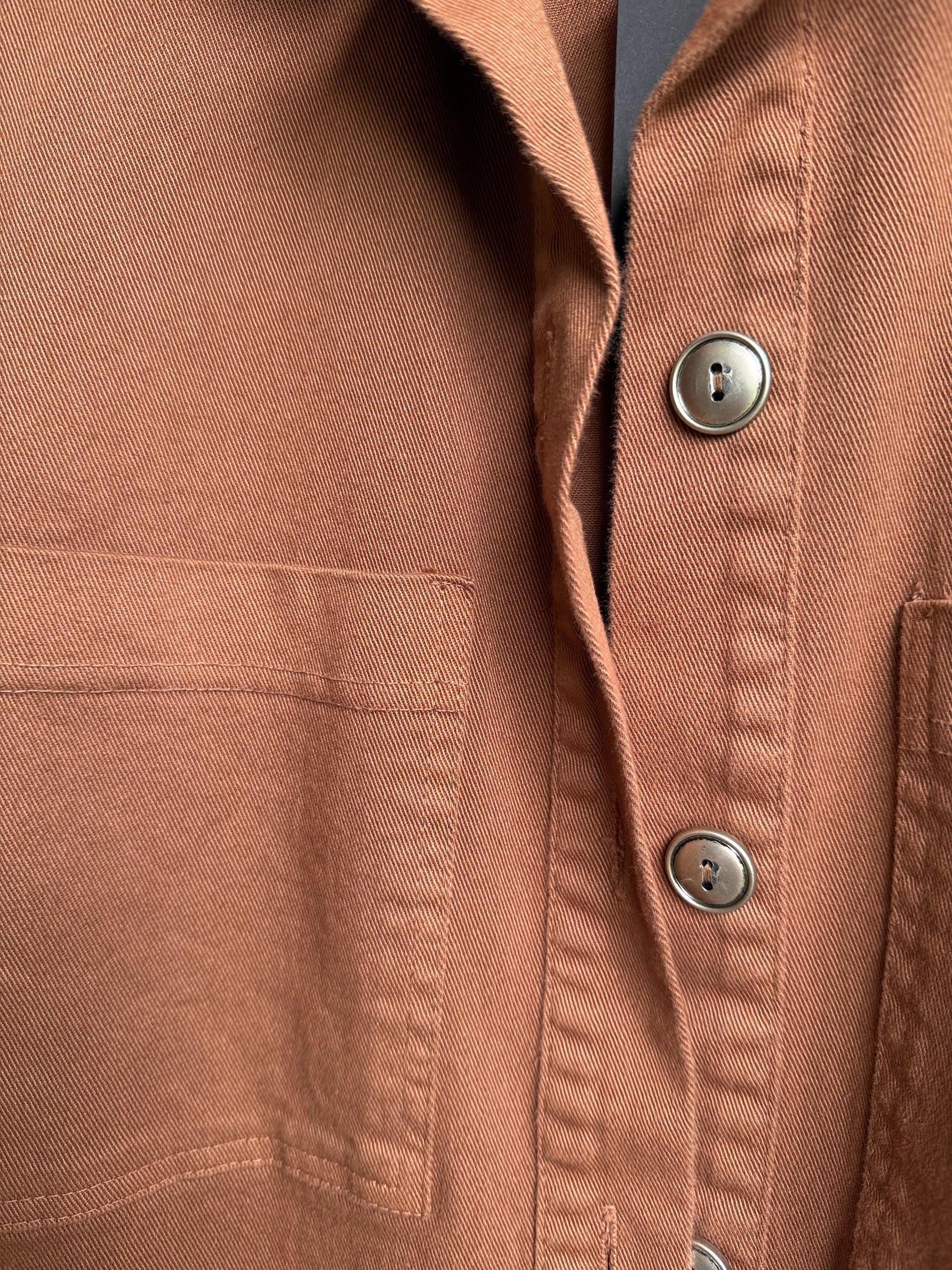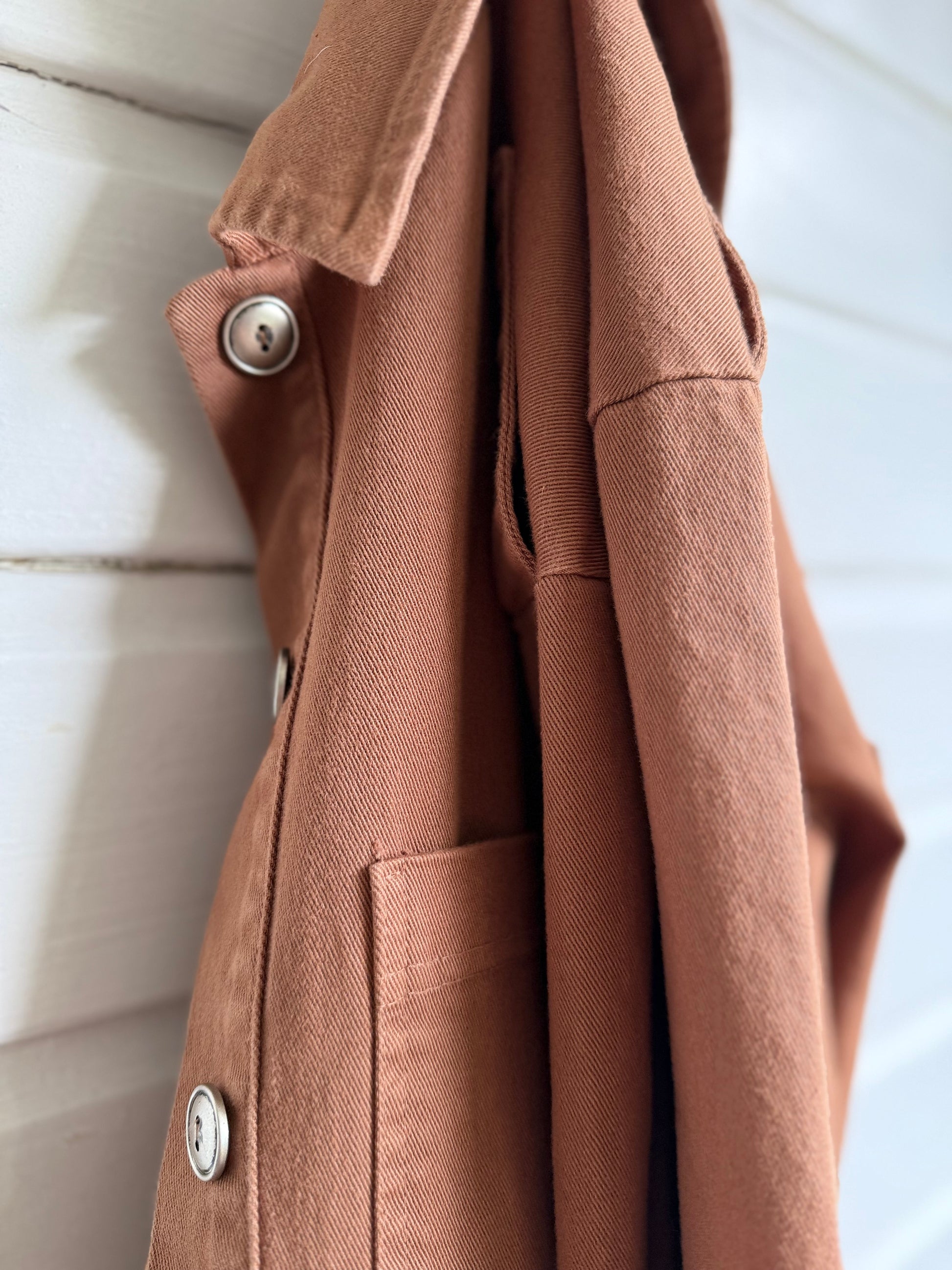 twee opgestikte grote zakken voor en leuke metalen knopen sluiting, kraag en manchet met knoop aan de mouw