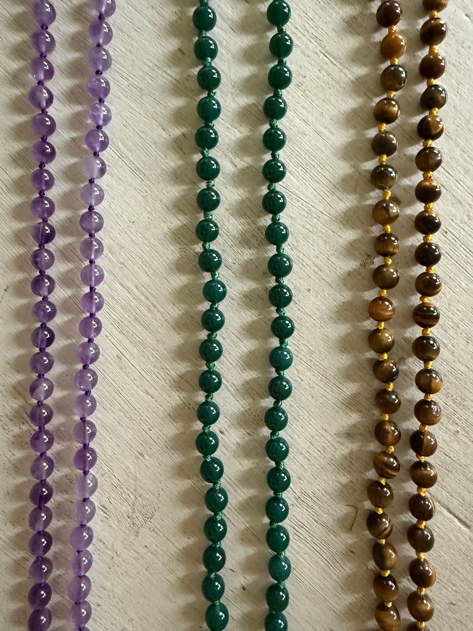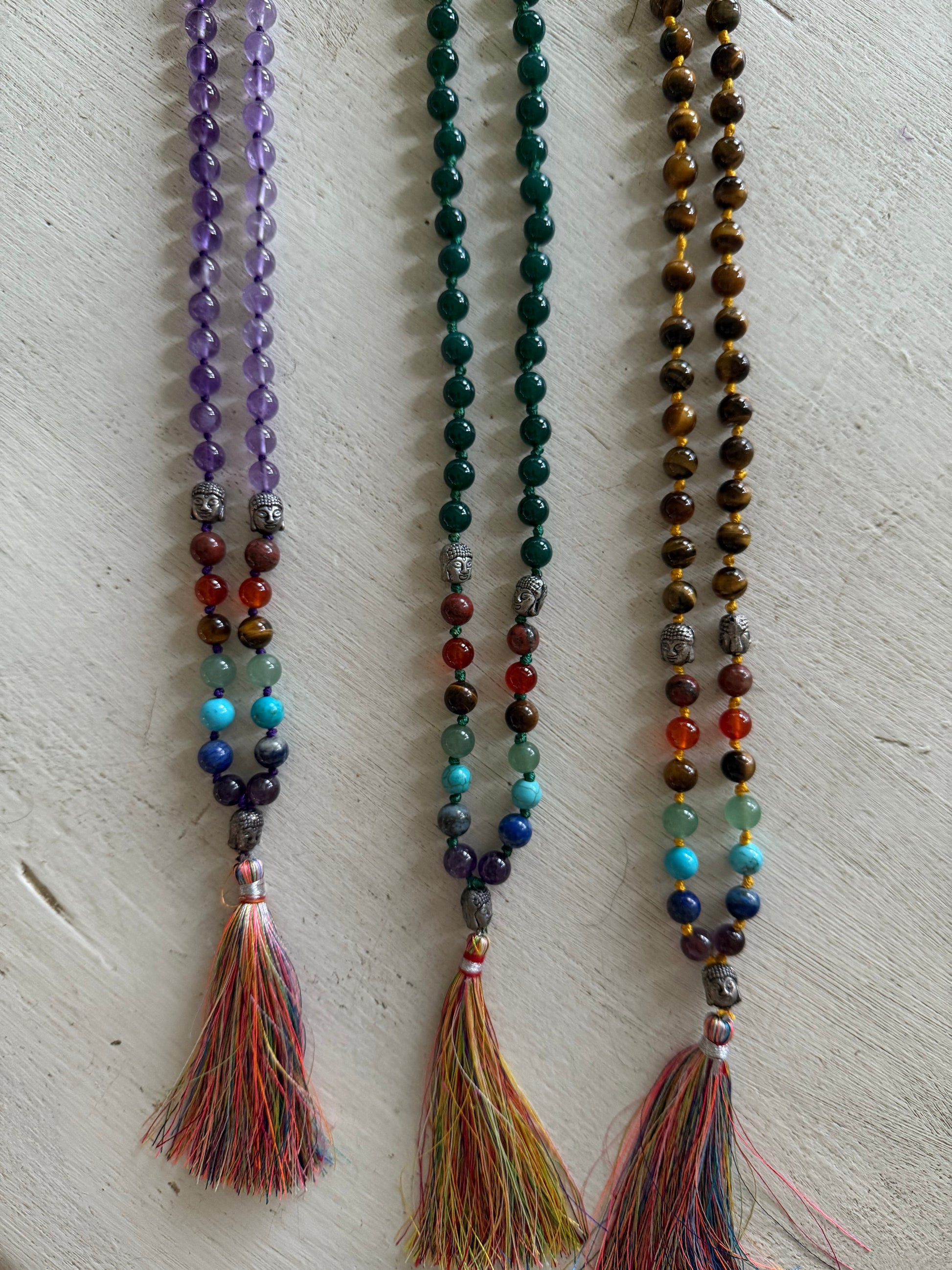 Mooie lange kralen ketting, groene half edelsteen met budhas en gekleurd zijde kwastje