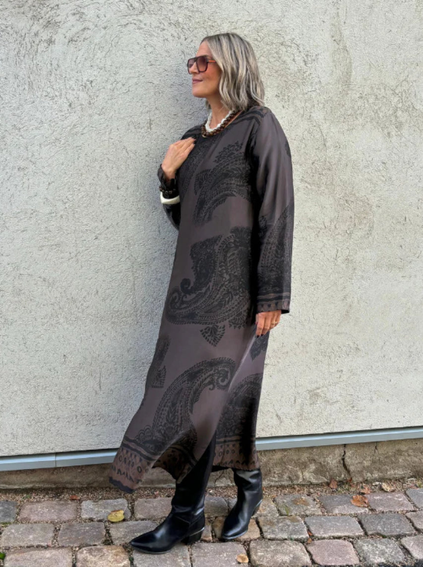 Prachtige lange jurk met een recht model met splitten aan beide zijde onder. Leuk stoer te dragen met een laars of meer chique met een hak. De jurk valt ruim.