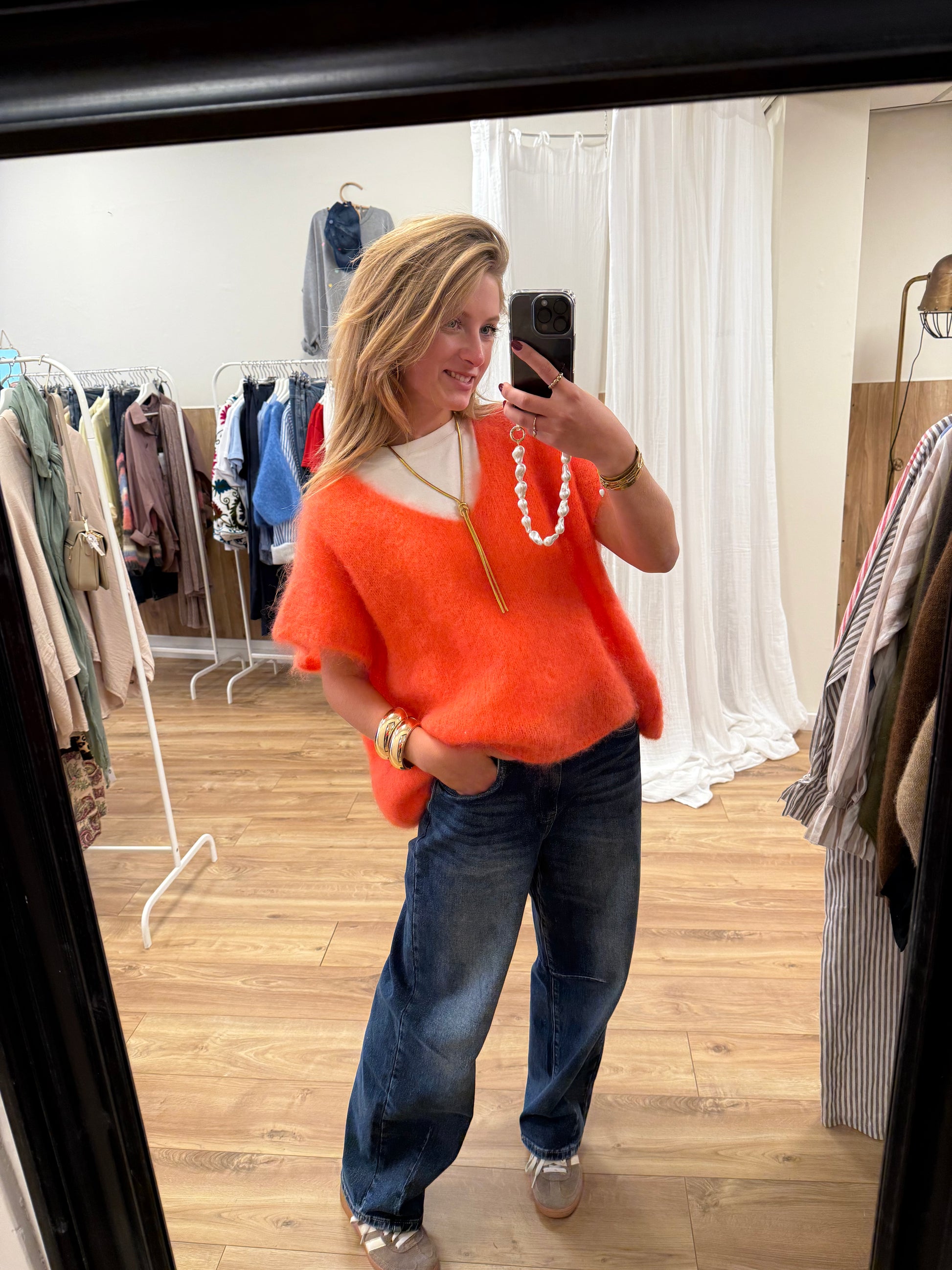 Leuk en oversized mohair spencer. Het is een oversized kort model. Hij heeft een v-hals en korte mouw. Het is een felle coral kleur. Het is een one size.