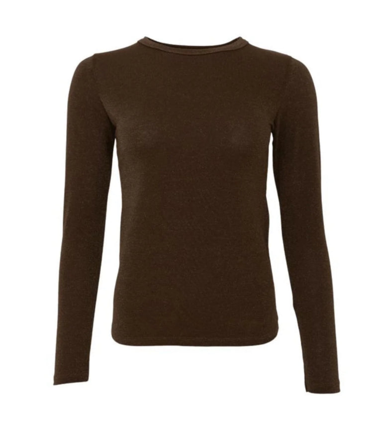 Fijn shirtje met glinsterend lurex-effect in de kleur chocolate. Ronde hals met lange mouwen.