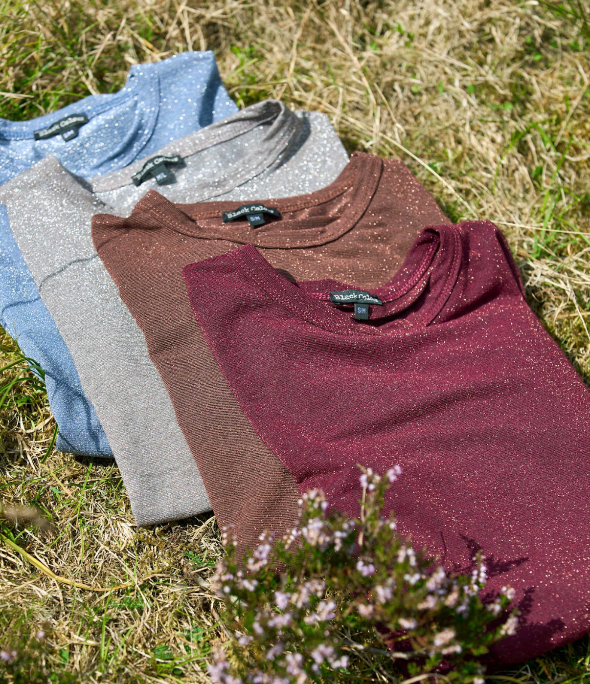 Fijn shirtje met glinsterend lurex-effect in de kleur taupe. Ronde hals met lange mouwen.