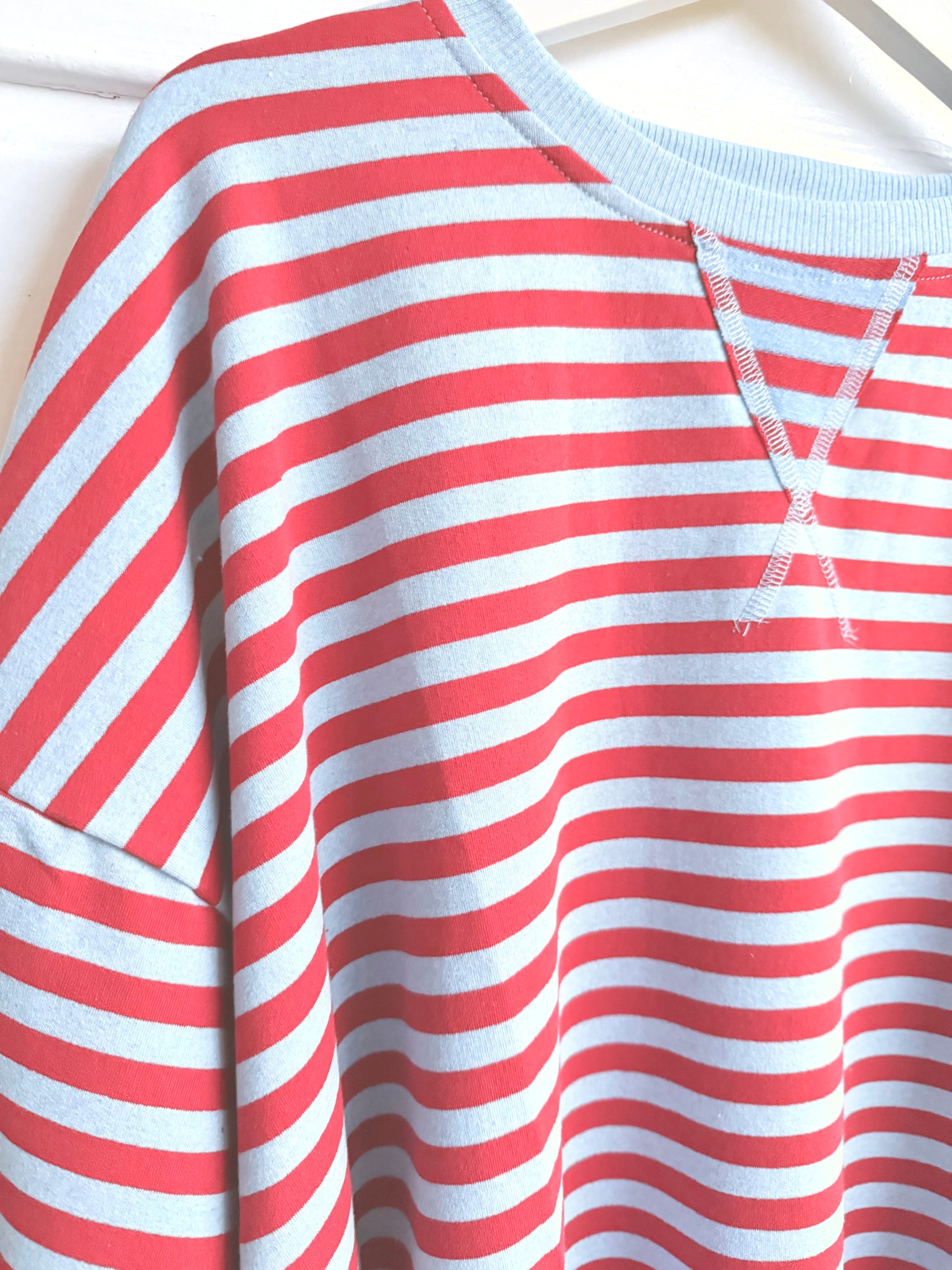 Super leuke oversized sweat shirt, rood / lichtblauwe streepjes, manchetten maar zonder boord.